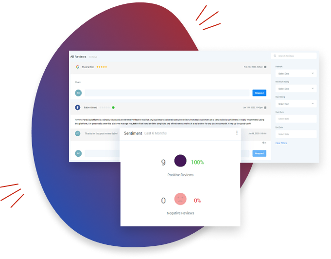 Send review requests via SMS and email with the push of a button. Monitor and reply to new reviews right within the dashboard.